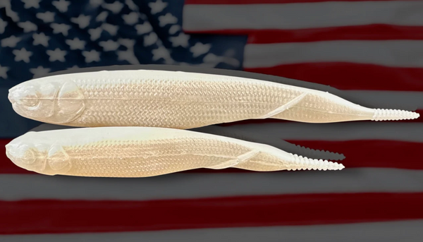 The end of the Freedom Flyer Minnow also comes equipped with a thin, ribbed tail section that readily produces a secondary quivering action with every twitch of the rod tip. Ideal for targeting suspended fish with forward-facing sonar, the Missile Baits Freedom Flyer Minnow can be rigged weightless, on scrounger heads or jig heads like the Missile Eye Roll, or on the back of a vibrating jig.